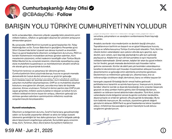 DEM Parti heyeti Silivri Cezaevi’nde tutuklu bulunan İBB Başkanı Ekrem İmamoğlu’nu cezaevinde ziyaret etti. Ziyaretin akabinde bugün Ekrem İmamoğlu’ndan Terörsüz Türkiye paylaşımı geldi. İstanbul Büyükşehir Belediye Başkanı Ekrem İmamoğlu, resmi X hesabı ‘@CBAdayOfisi’nden Terörsüz Türkiye bildirisi paylaştı. İmamoğlu, ‘Barışın yolu Türkiye Cumhuriyeti’nin yoludur’ dedi.