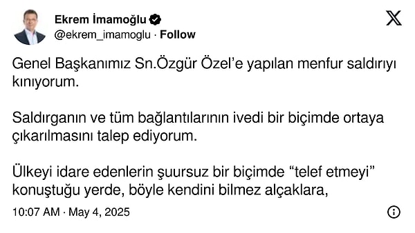 CHP’nin Cumhurbaşkanı adayı ve İBB Başkanı Ekrem İmamoğlu, saldırıya uğrayan Özgür Özel için paylaşımda bulundu.