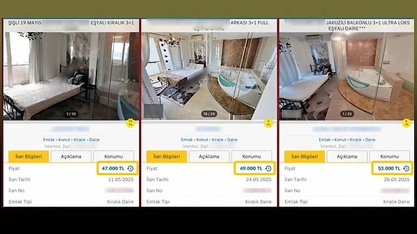 Ekol TV’den Mahmut Keşan’ın haberine nazaran, İstanbul Şişli’de tıpkı daire, üç farklı tarihte üç farklı emlakçı tarafından farklı kira bedelleriyle ilana konuldu.