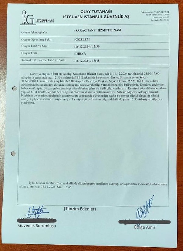 Selçuk Tengioğlu’nun İBB’deki imgeleri ve tutulan tutanak ortaya çıkarken, İstabul Emniyet Müdürlüğü de olayla ilgili açıklama yapmıştı.