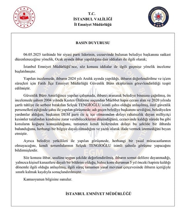 Özgür Özel’in açıklamasına nazaran, Selçuk Tengioğlu İBB binasına giderek Ekrem İmamoğlu’na suikast düzenleneceği ihbarında bulunmuştu.