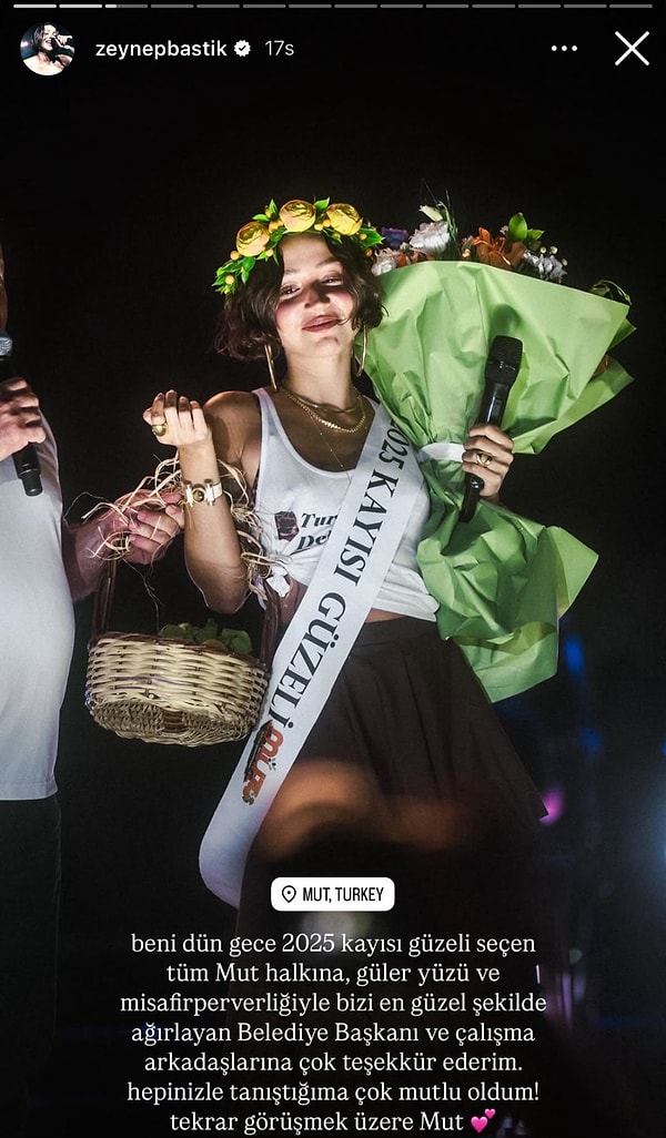 Mut’ta verdiği konserin akabinde halk tarafından 2025 Kayısı Hoşu seçildiği duyurulan Zeynep Bastık, aldığı unvanı şahsen kendisi kıssasında paylaştı, Belediye Lideri’ne da teşekkür etti.