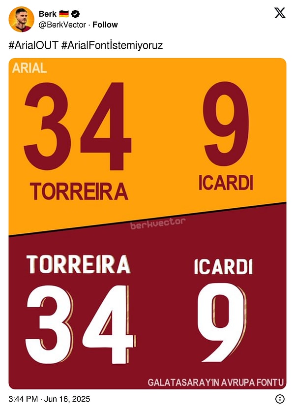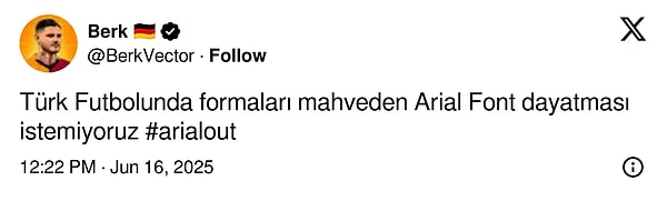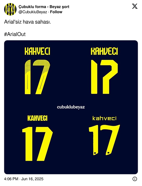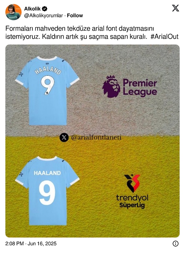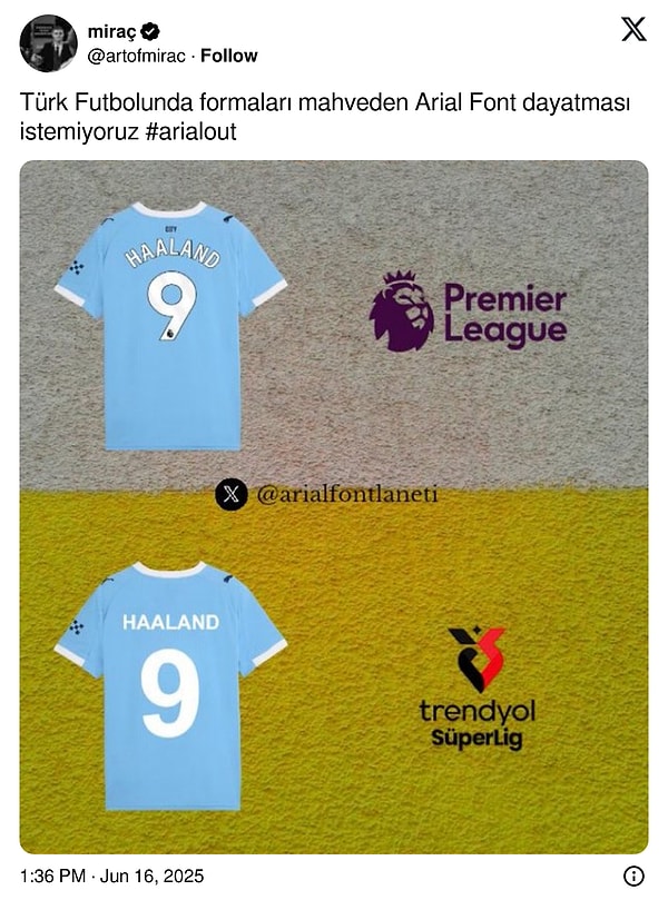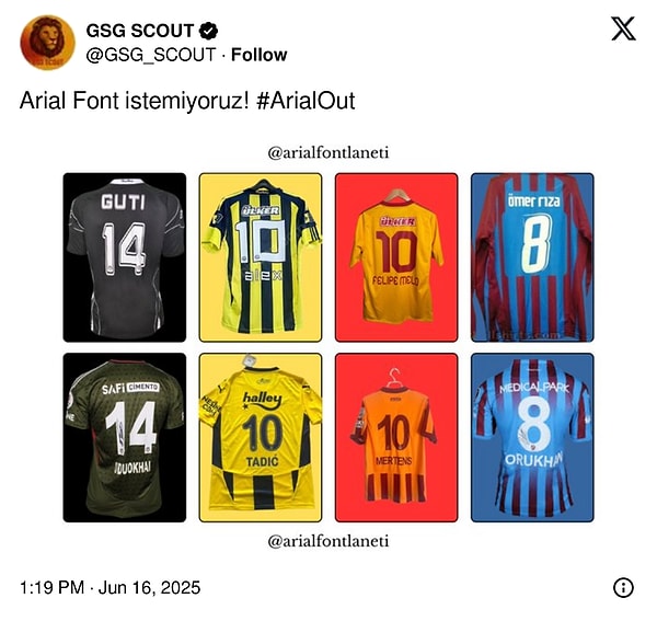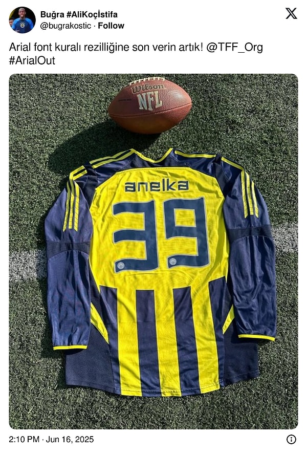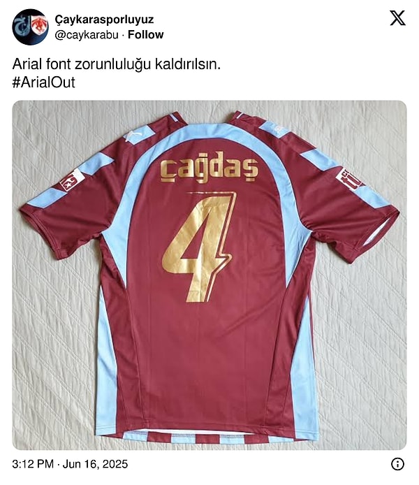 Ülkemizdeki tüm profesyonel futbol liglerinde forma isim ve numaralarında zarurî olan Arial font kullanımı, toplumsal medyada yine gündem oldu. Taraftarlar, bu uygulamanın artık terk edilmesi gerektiğini savunuyor. Ortak görüş, kulüplerin forma yazı tipi seçiminde özgür olması istikametinde.