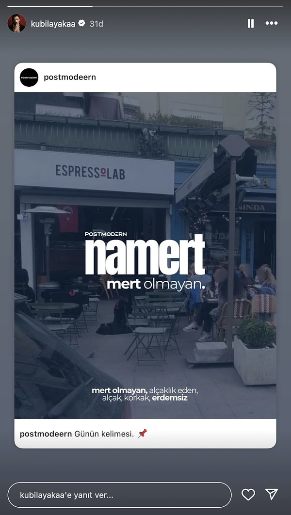 @postmodeern isimli hesabın bugün için hazırladığı ‘Namert’ gönderisini kıssasında paylaşan Kubilay Aka, Mert Vidinli’ye ‘Mert olmayan, alçaklık eden, alçak, korkak, erdemsiz’ çıkışında bulundu.