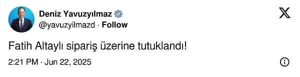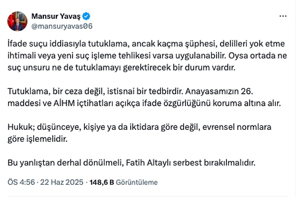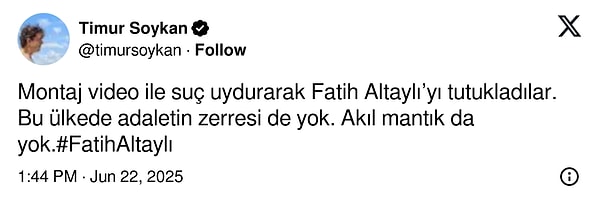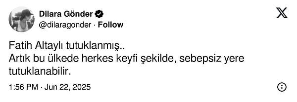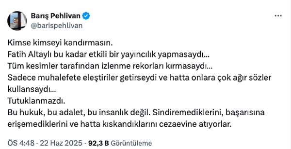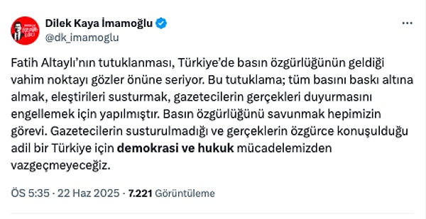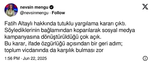 Gazeteci Fatih Altaylı dün akşam saatlerinde ‘cumhurbaşkanına tehdit’ suçlamasıyla Teşvikiye’deki konutundan gözaltına alındı. Tutuklama talebiyle sevki gerçekleştirilen Altaylı, yayında sarf ettiği kelamlar nedeniyle tutuklandı. Kısa müddette toplumsal medyada reaksiyonla karşılanan tutuklama kararı için çok farklı kulvarlardaki isimlerden paylaşımlar geldi.