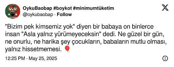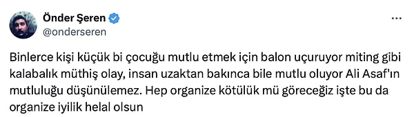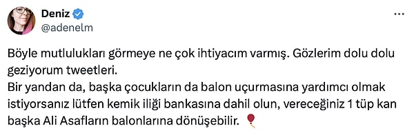 Ali Asaf bebeğin kanseri yendiğini duyuran babasının, “Bizim fazla etrafımız yok” diyerek yaptığı duygusal paylaşım toplumsal medyada büyük ilgi gördü. Balon uçurma davetine yüzlerce kişi dayanak verirken, Sancaktepe Belediyesi de aktiflik için harekete geçti. Toplanan onlarca kişi adeta içimizi ısıttı. Toplumsal medya kullanıcıları memnunluklarını gizleyemediler.