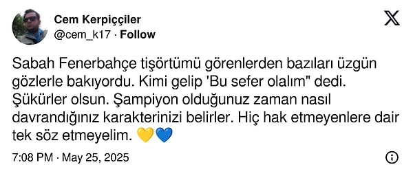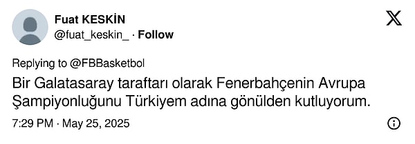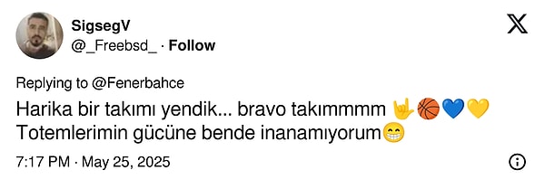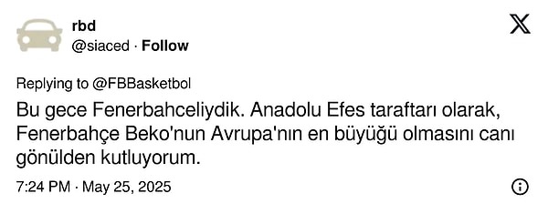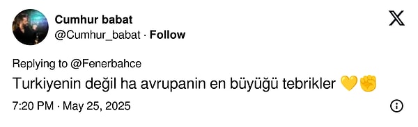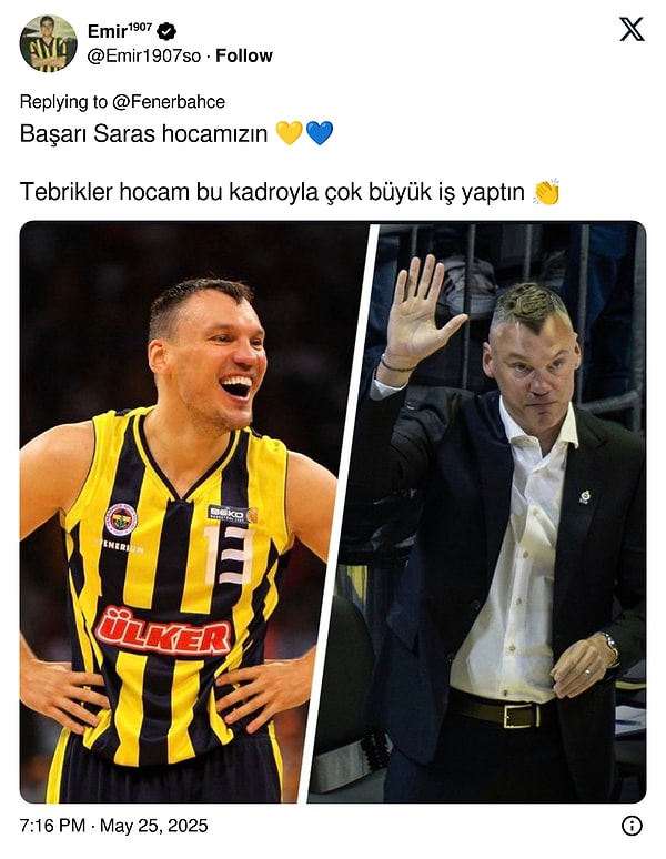Fenerbahçe, finalde Monaco’yu 81-70 mağlup ederek THY Avrupa Ligi Dörtlü Finali’ni kazandı. Bu tarihi zafer, sarı-lacivertli toplulukta büyük sevinç yarattı. Taraftarlar toplumsal medyada paylaşımlarıyla bu sevince ortak oldu.