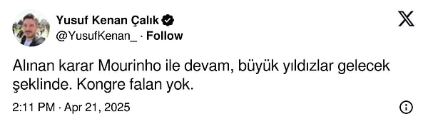Ekol TV ekranlarında yorumculuk yapan Fenerbahçeli eski spiker Yusuf Kenan Çalık, toplumsal medya hesabından ‘Alınan karar Mourinho ile devam, büyük yıldızlar gelecek biçiminde. Kongre falan yok.’ paylaşımında bulundu.