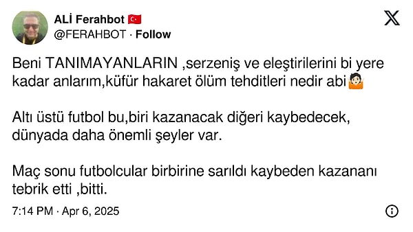 Ali Ferahbot, X’ten küfür, hakaret ve mevt tehditlerine sitem etti; “altı üstü futbol” dedi.