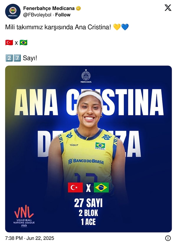 Fİlenin Sultanları, dün oynanan maçta Brezilya’ya 4 set sonunda 3-1 mağlup oldu. Brezilya ismine sahanın yıldızı ise Ana Cristina’ydı. Fenerbahçe forması giyen Brezilyalı atletin maçta attığı 27 sayı adeta kazananı belirlemişti. Fenerbahçe Voleybol hesabının maç sonu yaptığı Ana Cristina paylaşımı ise yenilgiyle tadı kaçan voleybol severleri biraz kızdırdı.