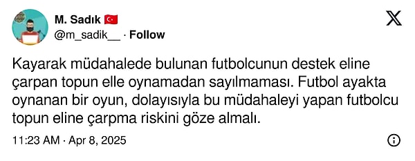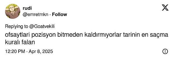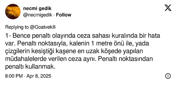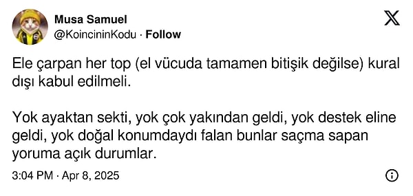 Sosyal medyada bir kullanıcının sorduğu “Futbolda en saçma bulduğunuz kural hangisi?” sorusu kısa müddette gündem oldu. Binlerce futbolseverin görüntülediği paylaşım, oyunun yıllardır tartışılan kurallarını yine masaya yatırdı. Yorumlarda en çok dikkat çeken kuralların başında elle oynama konumlarındaki değişkenlik geldi. (x: @goatvekili)