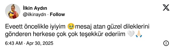 25 yaşındaki ulusal atlet, haberin akabinde kendisini merak eden sevenlerinin iletilerine yönelik toplumsal medya hesabından paylaşımda bulundu, şunları dedi:‘Eveett öncelikle düzgünüm 🥹mesaj atan hoş dileklerini gönderen herkese çok çok teşekkür ederiim 🤍🙏🏻’