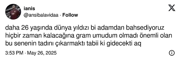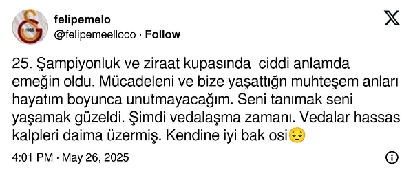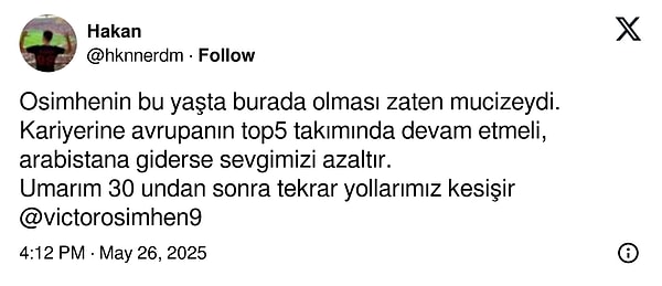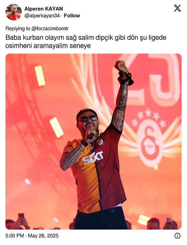 Galatasaray’da hem idarenin hem de taraftarın grupta kalması için büyük uğraş sarf ettiği Victor Osimhen adım adım Suudi Arabistan’a gidiyor üzere. Al Hilal yıldız oyuncunun formasını resmi internette satışa sunup çok kısa bir mühlet içinde atağını geri alırken 26 yaşındaki forvet de Instagram hesabından ‘Before I Go / Ben gitmeden önce’ müziğiyle paylaşım yaptı. Sarı-kırmızılılar, toplumsal medyada bu durumu ‘veda’ olarak yorumlarken biraz da sitem etti.