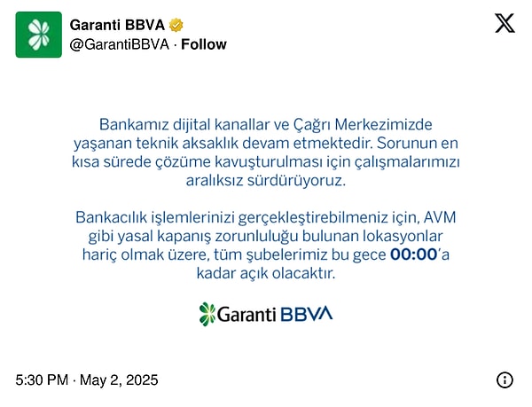 ‘Bankamız dijital kanallar ve Davet Merkezimizde yaşanan teknik aksaklık devam etmektedir. Sorunun en kısa müddette tahlile kavuşturulması için çalışmalarımızı aralıksız sürdürüyoruz. Bankacılık süreçlerinizi gerçekleştirebilmeniz için, AVM üzere yasal kapanış mecburiliği bulunan lokasyonlar hariç olmak üzere, tüm şubelerimiz bu gece 00.00’a kadar açık olacaktır.”