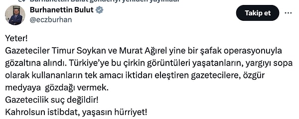 ‘Yeter!Gazeteciler Timur Soykan ve Murat Ağırel yeniden bir şafak operasyonuyla gözaltına alındı. Türkiye’ye bu berbat imajları yaşatanların, yargıyı sopa olarak kullananların tek emeli iktidarı eleştiren gazetecilere, özgür medyaya gözdağı vermek. Gazetecilik kabahat değildir!Kahrolsun istibdat, yaşasın hürriyet!’