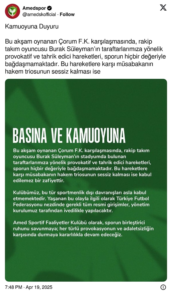 Amed Sportif Faaliyetler Kulübü olarak, sporun birleştirici ruhunu savunmaya; her türlü provokasyonun ve adaletsizliğin karşısında durmaya kararlılıkla devam edeceğiz.’