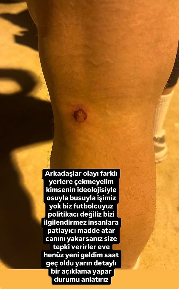 ‘Arkadaşlar olayı farklı yerlere çekmeyelim, kimsenin ideolojisiyle osuylabusuyla işimiz yok. Biz futbolcuyuz, siyasetçi değiliz. Bizi ilgilendirmez. İnsanlara patlayıcı husus atar, canını yakarsanız size reaksiyon verirler. Konuta şimdi yeni geldim, saat geç oldu. Yarın ayrıntılı bir açıklama yapar durumu anlatırız.’