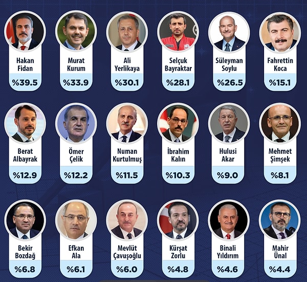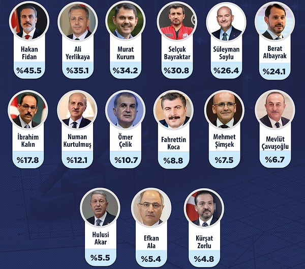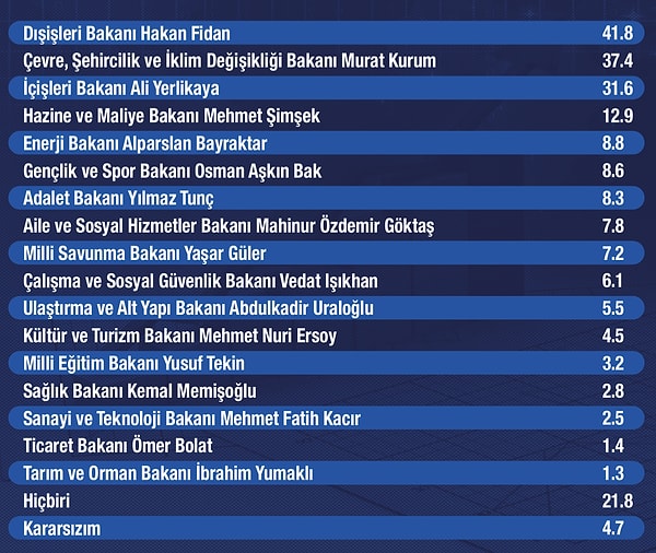 Mevcut hükümette şu an misyonda olan bakanlar ortasından en beğenilen ve en başarılı bulunan isimlerin hangileri olduğuna ait dağılım incelendiğinde % 41.8 Dışişleri Bakanı Hakan Fidan’ı işaret ederken, % 37.4’ü Etraf, Şehircilik ve İklim Değişikliği Bakanı Murat Kurum olduğunu  söyledi. (Cumhurbaşkanı Sayın Recep Tayyip Erdoğan’ın dışında sorulmuştur.)