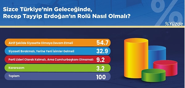 Türkiye’nin geleceğinde, Recep Tayyip Erdoğan’ın rolünün nasıl olması gerektiği ile ilgili görüşler incelendiğinde % 54.7’si faal halde siyasette olmaya devam etmesi gerektiğini tabir ederken % 9.2’si parti önderi olarak kalmalı ancak Cumhurbaşkanı olmaması gerektiğini söz etti.