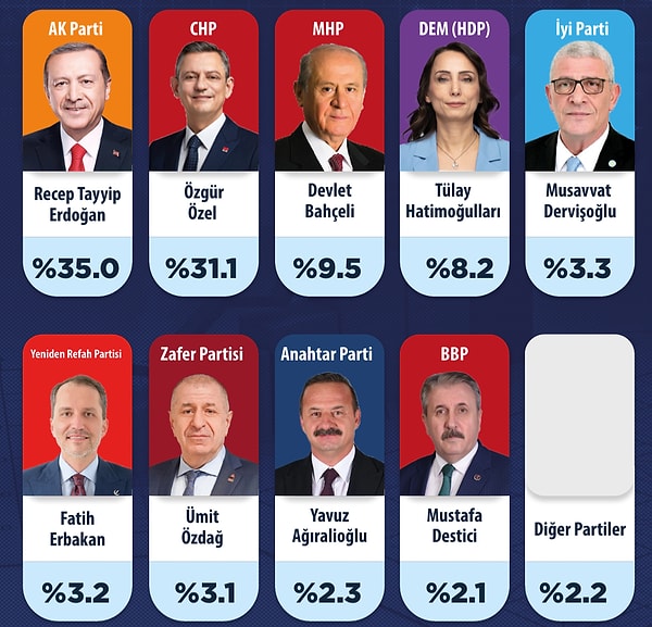 Şu an milletvekili genel seçimi olsa hangi partiye oy vereceğine ait dağılım incelendiğinde % 35 AKP -Recep-Tayyip Erdoğan’a oy vermek istediğini söz ederken % 31.1 CHP-Özgür Özel’e oy vermek istediğini belirtti.