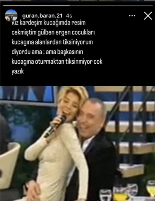 Baran ‘Kız kardeşim kucağımda fotoğraf çekmiştim. Gülben Ergen çocukları kucağına alanlardan tiksiniyorum diyordu ancak başkasının kucağına oturmaktan tiksinmiyor çok yazık’ sözlerini kullandı.