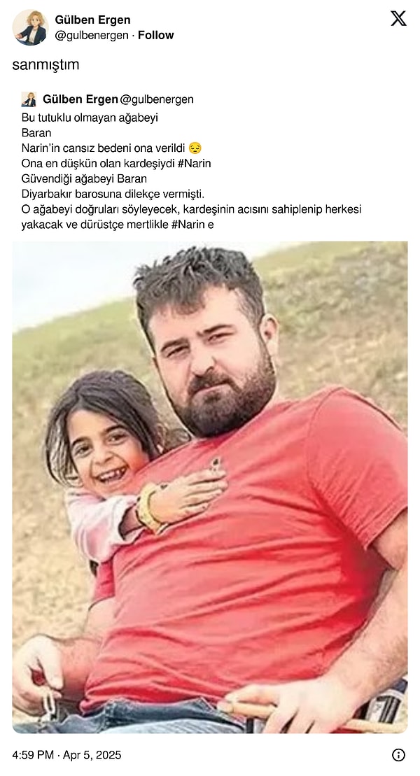 ‘editciablan’ isimli hesabı Baran Güran’ın son paylaşımını kıssasından paylaştı. Baran Güran, Narin davasında sıkça gündeme gelen ve değerli açıklarda bulunup mahkeme salonuna dahi giden Gülben Ergen’i berbat sözlerle gaye aldı.