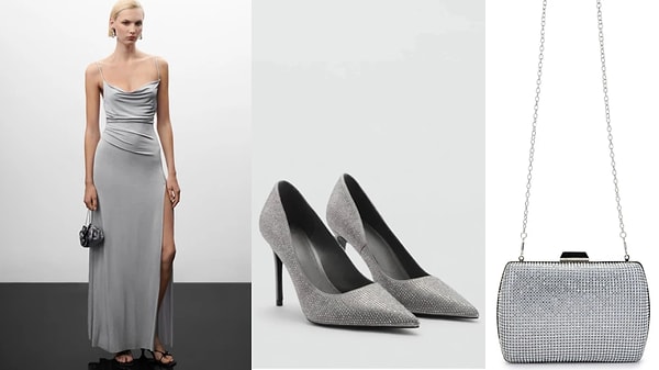 Geceye adım atarken “ben geldim” demenin en tarz sahibi hali bu kombin olabilir. Dökümlü yırtmaçlı elbise zarafetiyle göz kamaştırırken, strass taşlı topuklular adeta yürüdükçe ışıldıyor. Vegan ağabeye çanta ise tüm kombine hem şıklık hem de sürdürülebilir bir dokunuş katıyor. Hem trend, hem elegan, hem de gönül rahatlığıyla taşıyabileceğin bir stil… Düğün, davet, özel akşam yemeği? Neresi olursa olsun, bu kombinle gözler senin üzerinde!