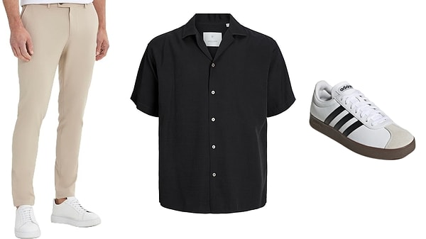 Rahatlık ve şıklık bir ortada olur mu? Bu kombin diyor ki: “Hem de en güzelinden olur!” Bej tonlarında, esnek yapısıyla gün uzunluğu konfor sunan slim fit pantolonla hafif dokulu, desenli kısa kollu gömlek bir ortaya gelince ortaya salaş ancak tarz sahibi bir görünüm çıkıyor. Ayaklardaysa sade ancak çağdaş spor ayakkabılar var; yürürken rahat, bakarken cool! Bu kombin tam manasıyla “bugün ne giysem” sorusunun en havalı karşılığı. Rahat et, şık kal, usulünden ödün verme.