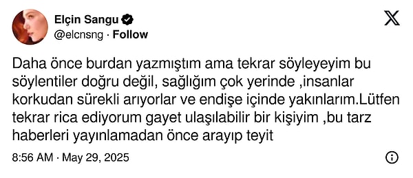 Sosyal medyada yayılan “beyninde kitle bulundu” ve “yurt dışında tedavi görüyor” tezleri bir anda ortalığı karıştırdı. Ünlü oyuncunun hayranları tasalarını lisana getirirken Elçin Sangu haberlere ateş püskürdü.