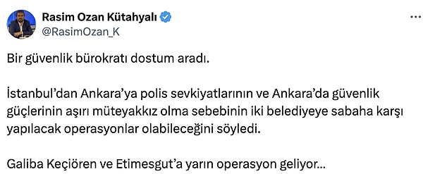 Kütahyalı bu defa Keçiören ve Etimesgut Belediyelerine operasyon yapılacağını öne sürdü.