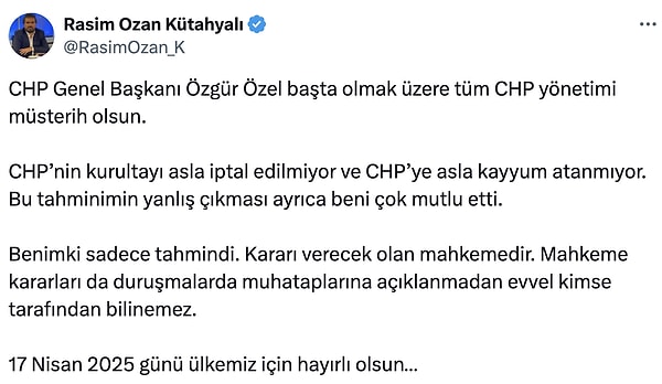 ‘Yarın Kasım 2023 CHP kurultayı iptal ediliyor. CHP’ye süreksiz kayyum atanarak, 45 gün sonra 1 Haziran 2025’te CHP’nin yeni kurultayına gidiliyor. Kayyum Hikmet Çetin olacak deniyor.