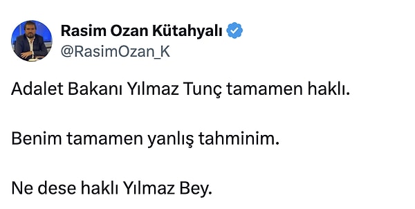 Ardından Adalet Bakanı Yılmaz Tunç devreye girdi. Rasim Ozan Kütahyalı hakkında soruşturma başlatıldığını duyurdu.