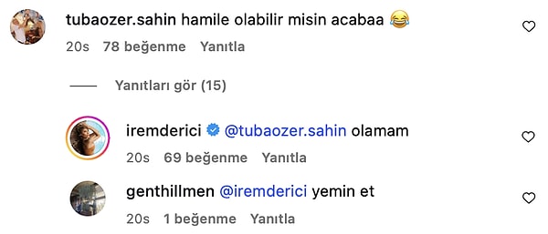 Bir toplumsal medya kullanıcısı, bir umut İrem Derici’ye ‘Hamile olabilir misin sanki?’ sorusunu yöneltti. Artık o ışıltıyı mı gördü kendince niyet mi etti bilemiyoruz fakat İrem Derici’den de jet süratiyle cevap geldi.