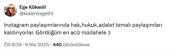‘Instagram paylaşımlarında hak,hukuk,adalet temalı paylaşımları kaldırıyorlar. Gördüğüm en aciz müdahale :)’