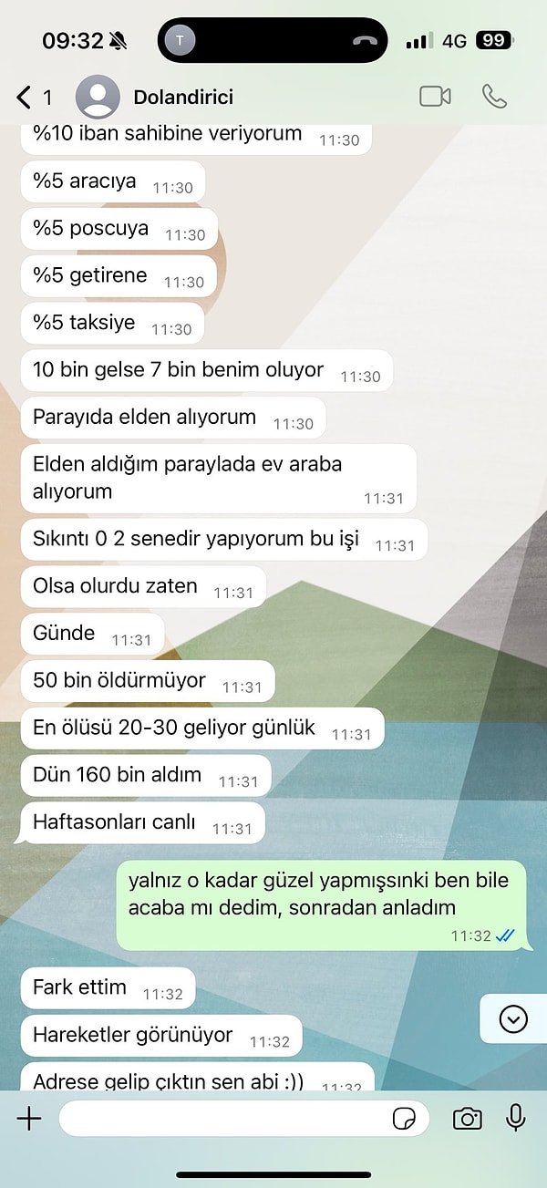 Bu seferki örnek de bir epey değişik. Dolandırıcının verdiği linkteki koda bakan alıcı, durumu fark ettiğini dolandırıcıya bildiriyor. Ve bakın nasıl bir diyalog yalanıyor?