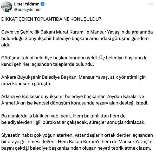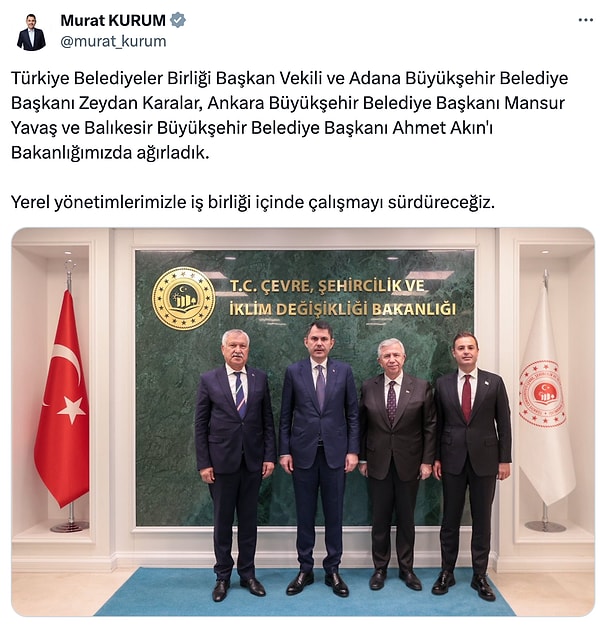 ‘Türkiye Belediyeler Birliği Lider Vekili ve Adana Büyükşehir Belediye Başkanı Zeydan Karalar, Ankara Büyükşehir Belediye Lideri Mansur Yavaş ve Balıkesir Büyükşehir Belediye Başkanı Ahmet Akın’ı Bakanlığımızda ağırladık. Yerel yönetimlerimizle iş birliği içinde çalışmayı sürdüreceğiz.’
