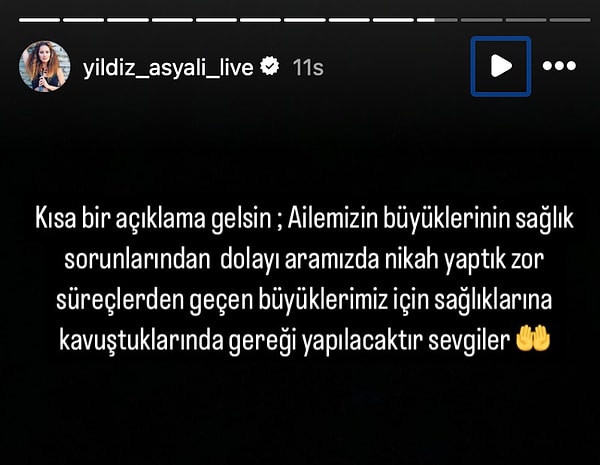 Asyalı, apar topar evlenmelerinin nedenini şu halde açıkladı: ‘Ailemizin büyüklerinin sıhhat sıkıntılarından ötürü ortamızda nikah yaptık. Sıkıntı süreçlerden geçen büyüklerimiz için. Sıhhatlerine kavuştuklarında gereği yapılacaktır.’