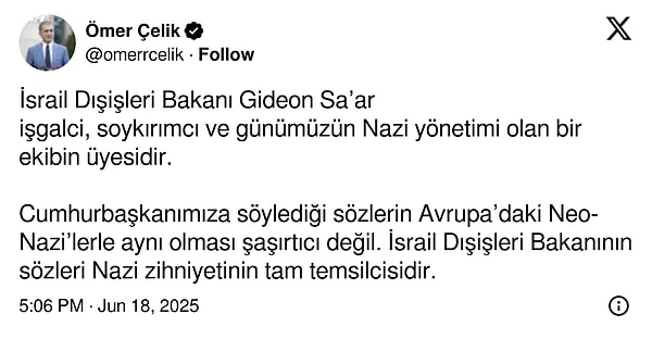 ‘İsrail Dışişleri Bakanı Gideon Sa’ar işgalci, soykırımcı ve günümüzün Nazi idaresi olan bir takımın üyesidir.