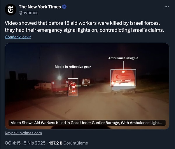 Ancak The New York Times’ın kamuoyuyla paylaştığı yeni imgeler İsrail’in sıhhat çalışanlarına yönelik hücum münasebetlerini çürüttü. Gün yüzüne çıkan görüntü kaydında kaza yapmış bir ambulansa yardım etmek için duran araçlardan inen takımların Kızılay kıyafeti giydiği ve araçlardaki acil durum sinyallerinin çalışır halde olduğu görülüyor.