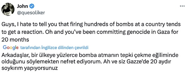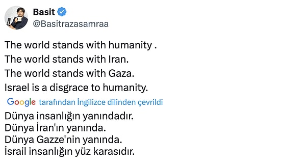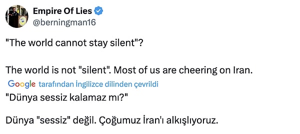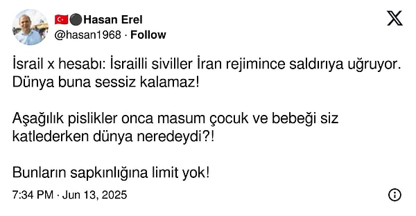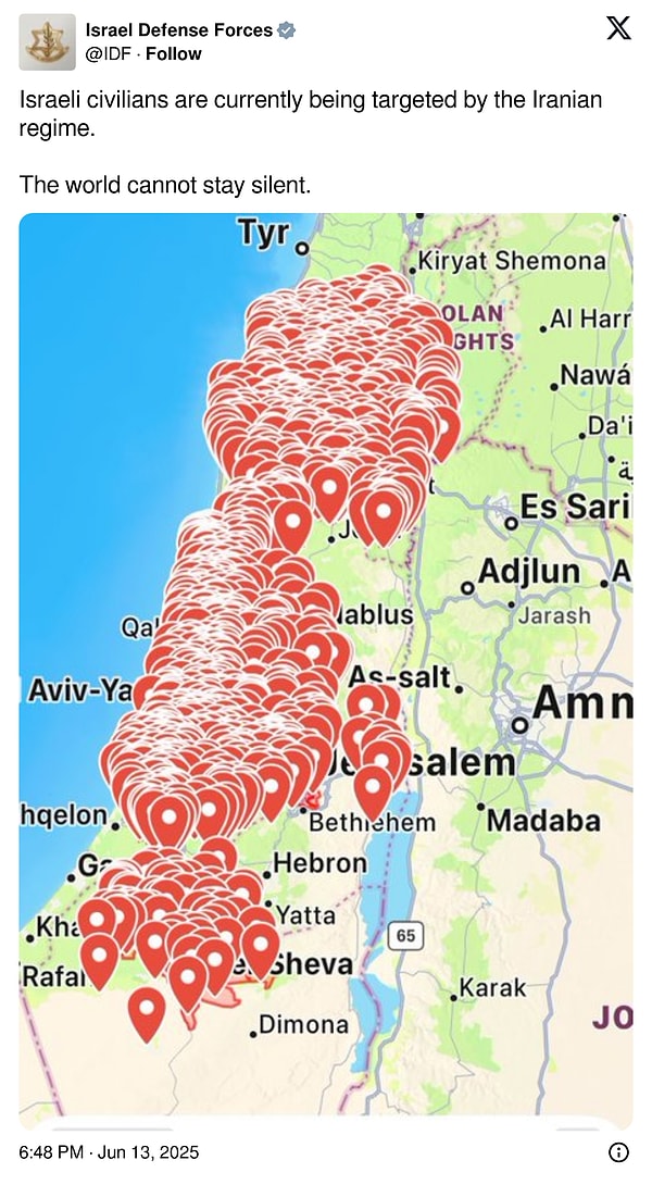 İsrail 13 Haziran’da sabaha karşı İran’a hava saldırısı başlattı. Bu akınlara İran’dan karşılık 13 Haziran akşamı geldi. İran, başşehir Tel Aviv ve Hayfa’ya füzelerle saldırdı. İsrail Savunma Kuvvetleri, resmi X hesabından İran’ın sivilleri gaye aldığı sav edilen bir paylaşım yapıldı ve bu paylaşıma ‘Dünya sessiz kalamaz’ notu düşüldü. Paylaşıma dünyanın dört bir yanındaki X kullanıcılarından reaksiyon yağdı.