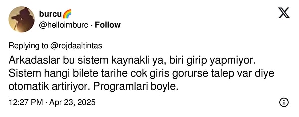 Arkadaşlar bu sistem kaynaklı ya, biri girip yapmıyor. Sistem hangi bilete, tarihe çok giriş görürse talep var diye otomatik artıyor. Programları bu türlü.