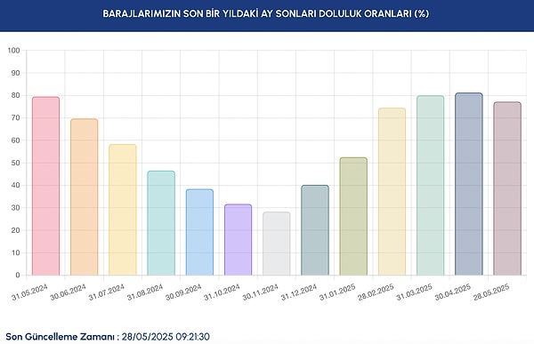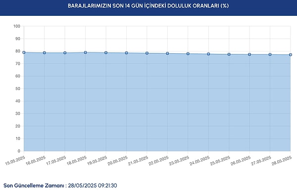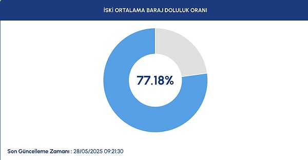 Buna nazaran İstanbul barajlarında doluluk oranı 28 Mayıs 2025 Çarşamba yüzde 77.18 oldu.