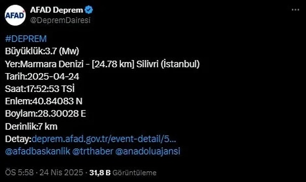 Deprem Silivri açıklarında yerin 7 km altında saat 17.52’de meydana geldi. İşte AFAD’ın açıklaması:
