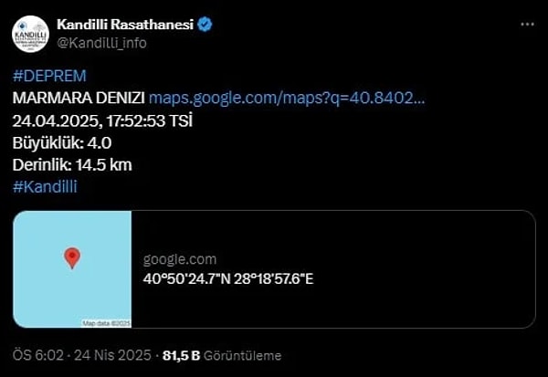 Kandilli Rasathanesi ise sarsıntının şiddetini 4.0 olarak açıkladı.