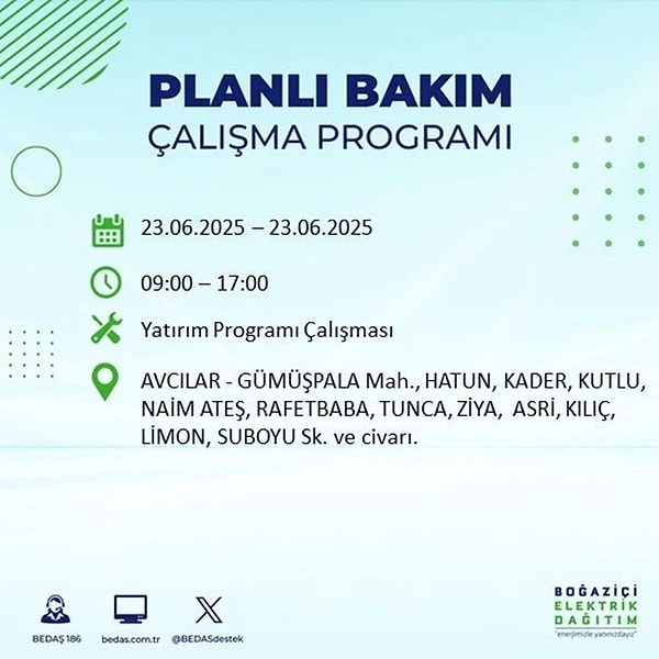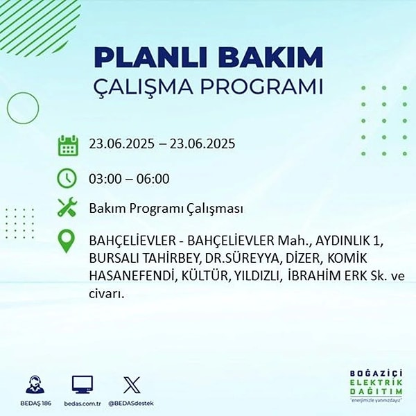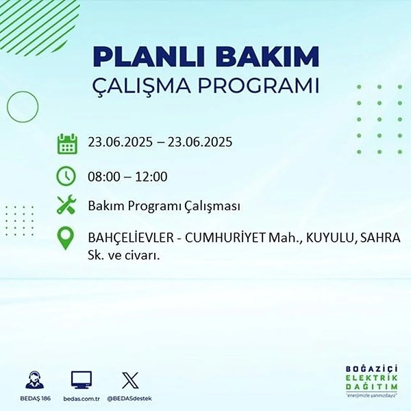 İstanbul’da bugün planlı bakım ve yatırım çalışmaları kapsamında elektrik kesintileri yaşanacak. İstanbul’un birçok ilçesinde yaşanacak olan Elektrik kesintilerini Boğaziçi Elektrik Dağıtım A.Ş, (BEDAŞ) açıkladı. Pekala İstanbul’da hangi ilçelerde elektrikler kesilecek? İşte BEDAŞ’ın açıklamasına nazaran İstanbul’da elektrik kesilecek ilçeler ve elektriklerin kesileceği saatler…