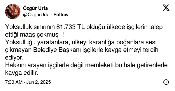 Yoksulluğu yaratanlara, ülkeyi karanlığa boğanlara sesi çıkmayan Belediye Başkanı işçilerle kavga etmeyi tercih ediyor.