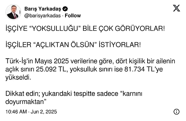 Türk-İş’in Mayıs 2025 datalarına nazaran, dört kişilik bir ailenin açlık hududu 25.092 TL, yoksulluk sonu ise 81.734 TL’ye yükseldi.