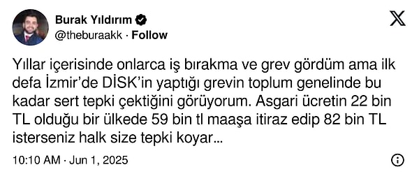 ‘Yıllar içerisinde onlarca iş bırakma ve grev gördüm fakat birinci kere İzmir’de DİSK’in yaptığı grevin toplum genelinde bu kadar sert reaksiyon çektiğini görüyorum. Taban fiyatın 22 bin TL olduğu bir ülkede 59 bin tl maaşa itiraz edip 82 bin TL isterseniz halk size reaksiyon koyar…’
