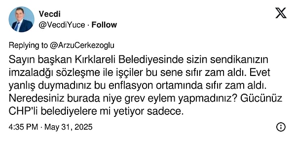 ‘Sayın lider Kırklareli Belediyesinde sizin sendikanızın imzaladığı mukavele ile çalışanlar bu sene sıfır artırım aldı. Evet yanlış duymadınız bu enflasyon ortamında sıfır artırım aldı. Neredesiniz burada niçin grev hareket yapmadınız? Gücünüz CHP’li belediyelere mi yetiyor yalnızca.’