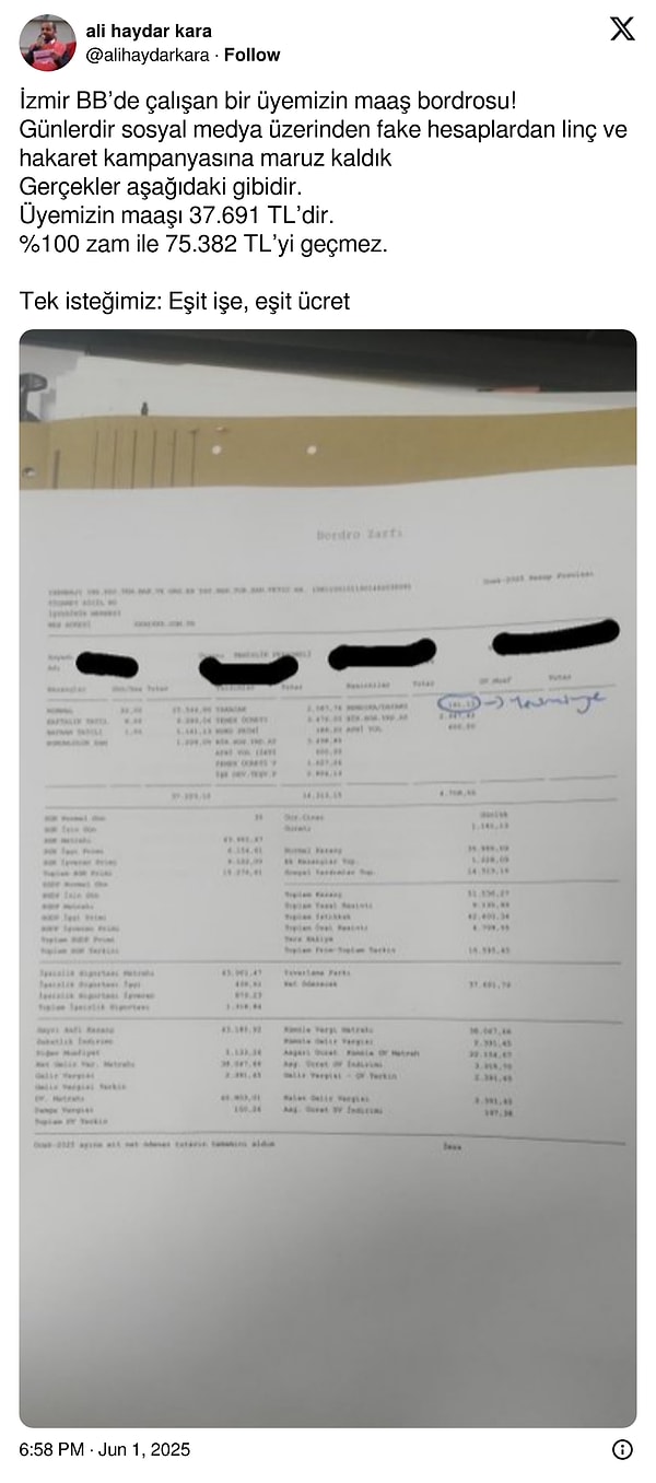 ‘İzmir BB’de çalışan bir üyemizin maaş bordrosu!